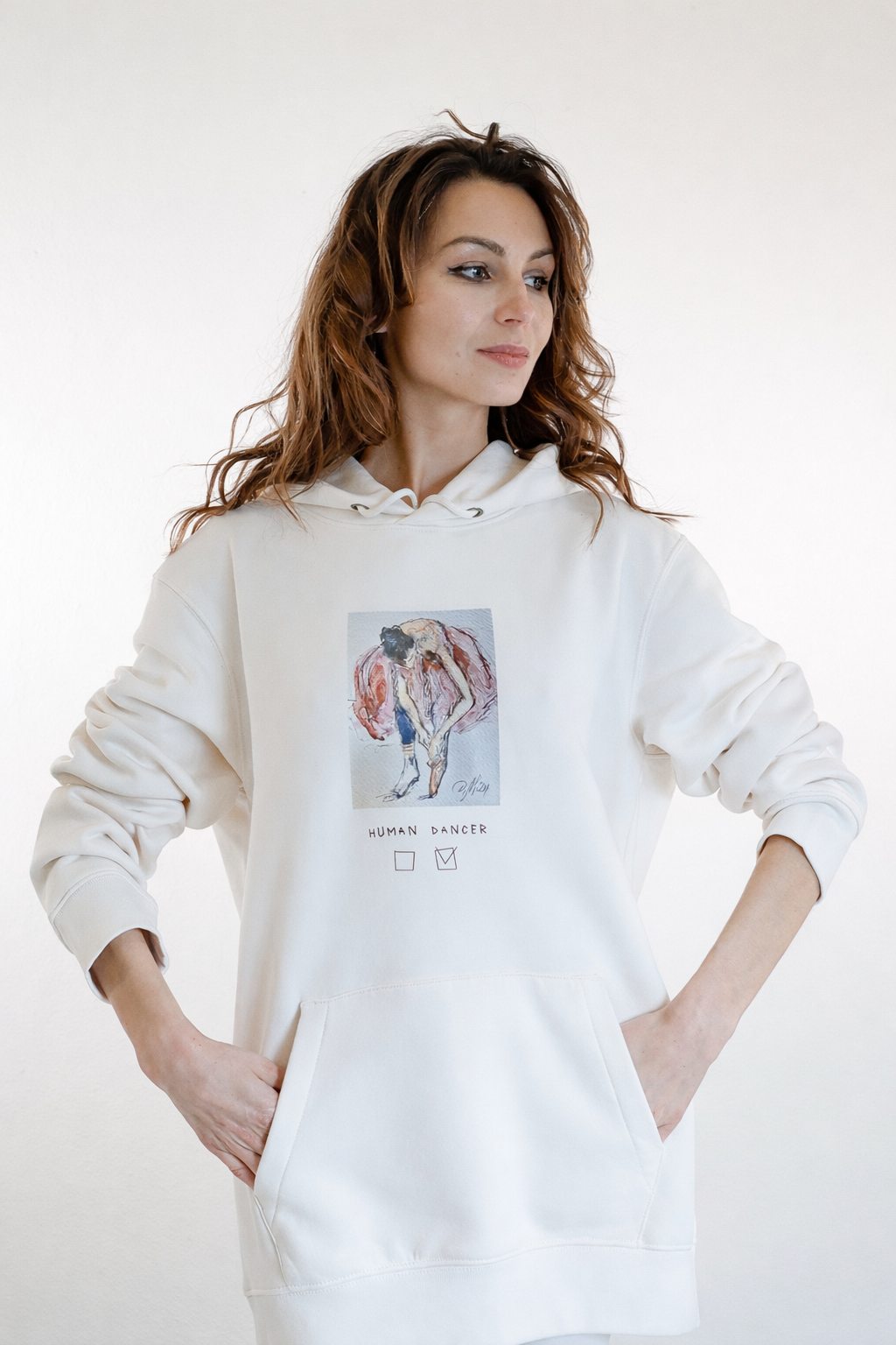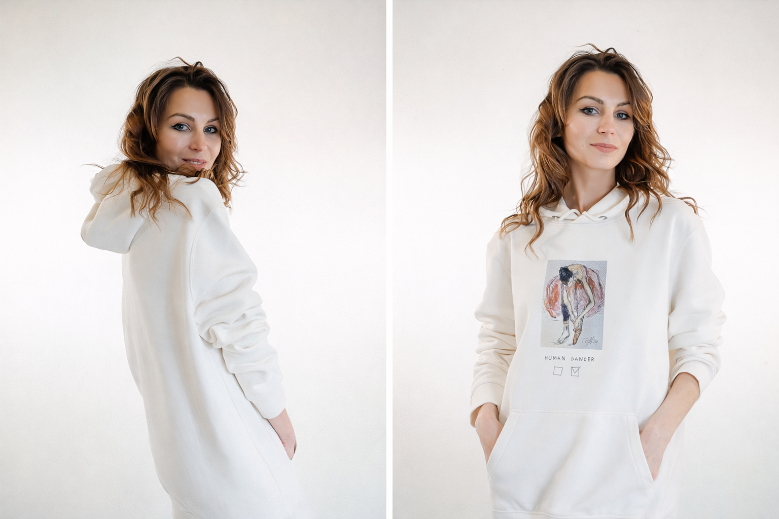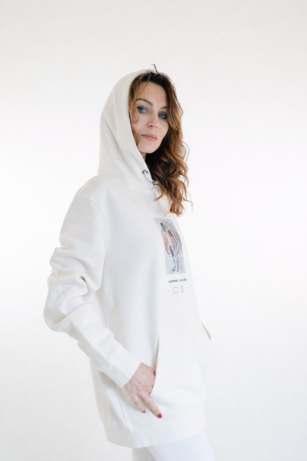 Double-layer hood · kangaroo pocket · recycled metal eyelets