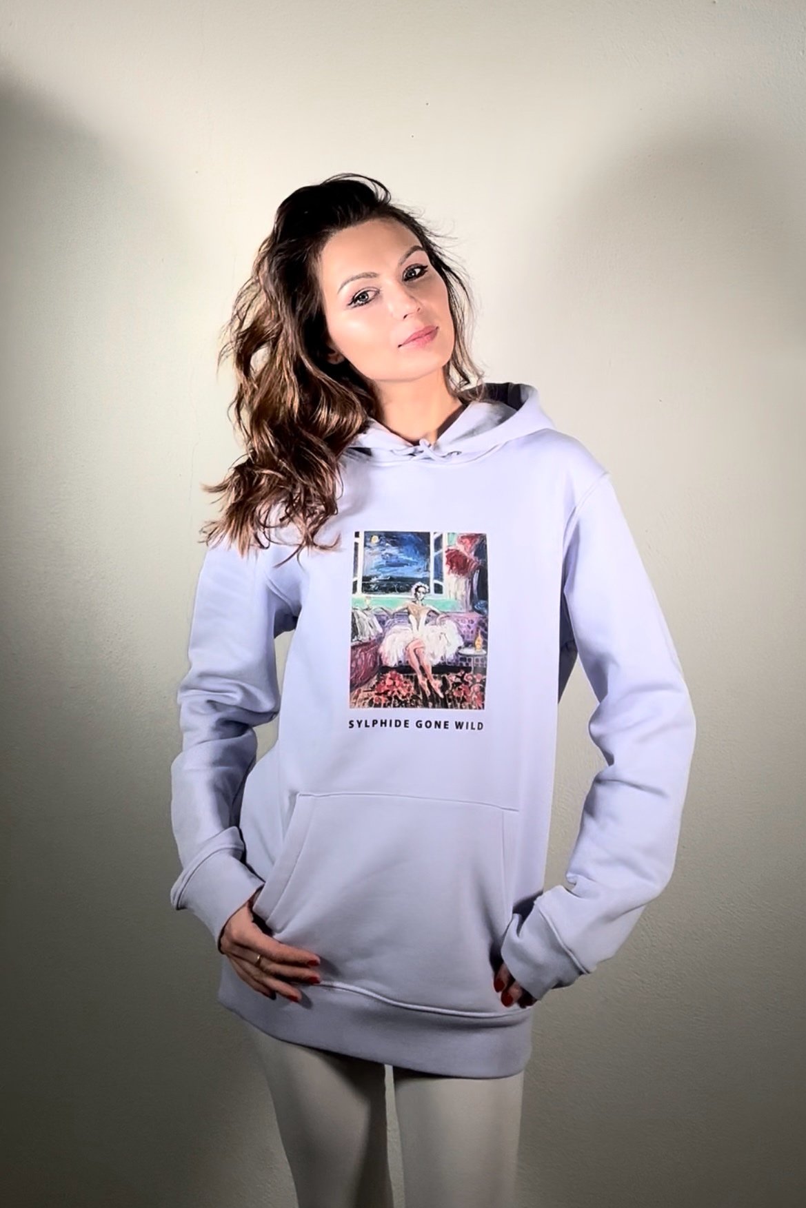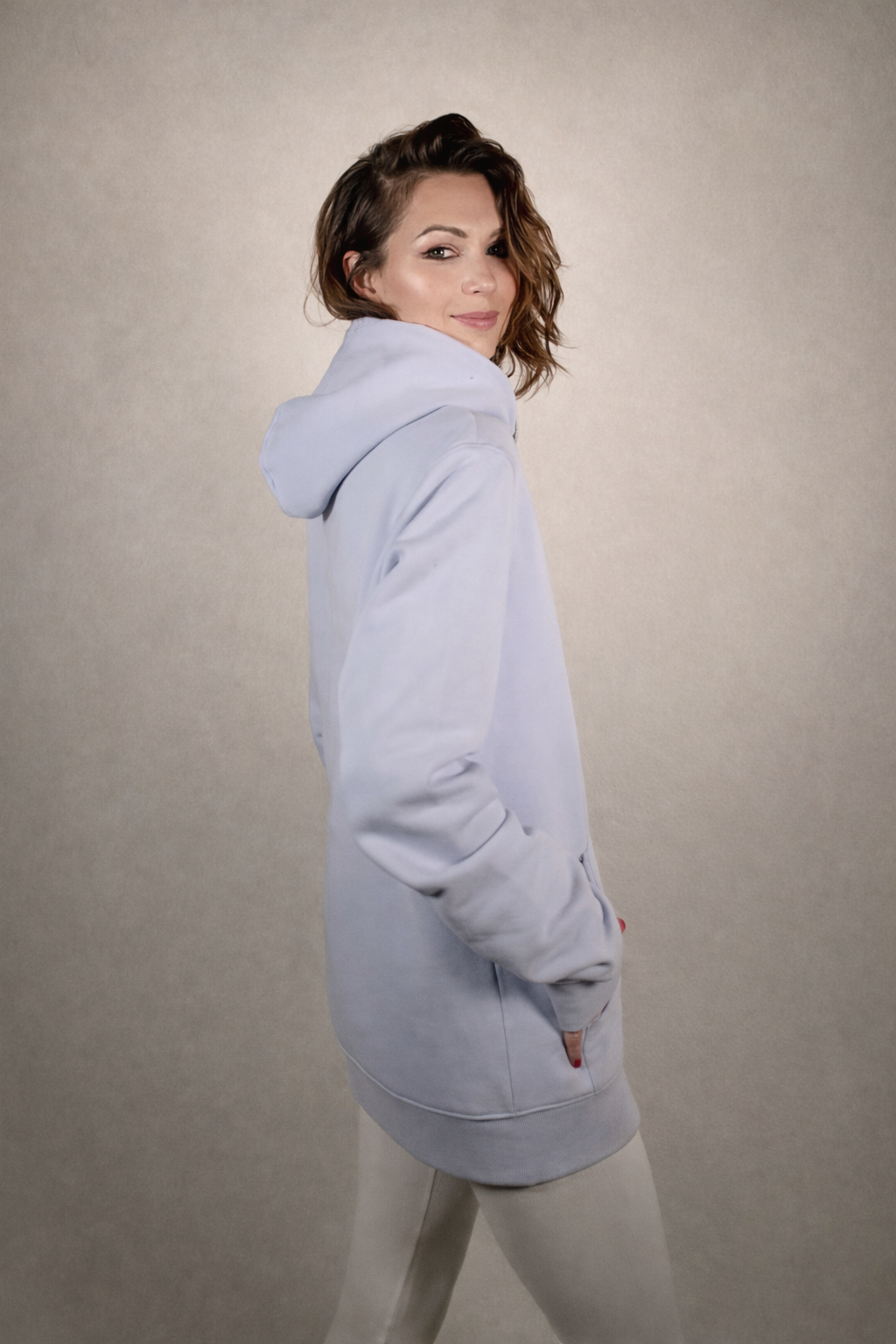 Double-layer hood · kangaroo pocket · recycled metal eyelets